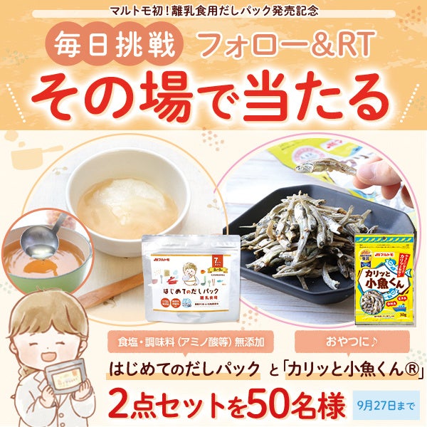 マルトモ公式Twitter 【@Marutomo_CoLtd】をフォローし、キャンペーン投稿にリツイートをすると、抽選で50名様に新商品「はじめてのだしパック」と「カリッと小魚くん®」が当たります!応募終了となる9月27日まで毎日応募可能となります。