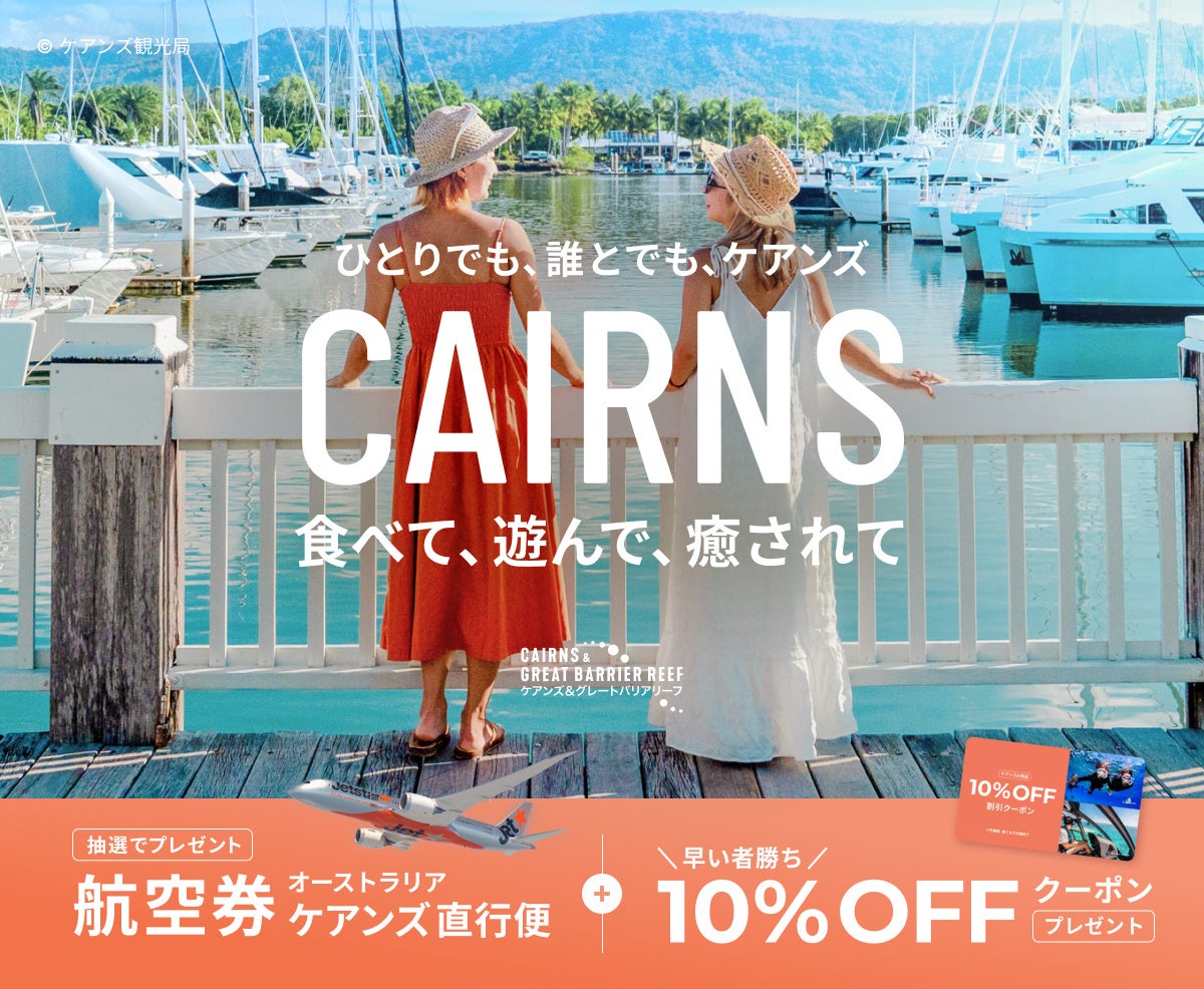 現地体験型アクティビティ専門予約サイト『ベルトラ』を運営するベルトラ株式会社(本社:東京都中央区、代表取締役社長:二木 渉)は、ケアンズ観光局協賛のもと、ケアンズの魅力を伝える共同プロモーションを2025年1月16日(木)より開始いたしました。特設サイト「ひとりでも、誰とでも、ケアンズ 食べて、遊んで、癒されて」の公開にあわせて、日本(成田・関西空港)⇔ケアンズの往復航空券が抽選で当たるプレゼントキャンペーンを実施するほか、先着200名様限定で10%オフクーポンを配布いたします。