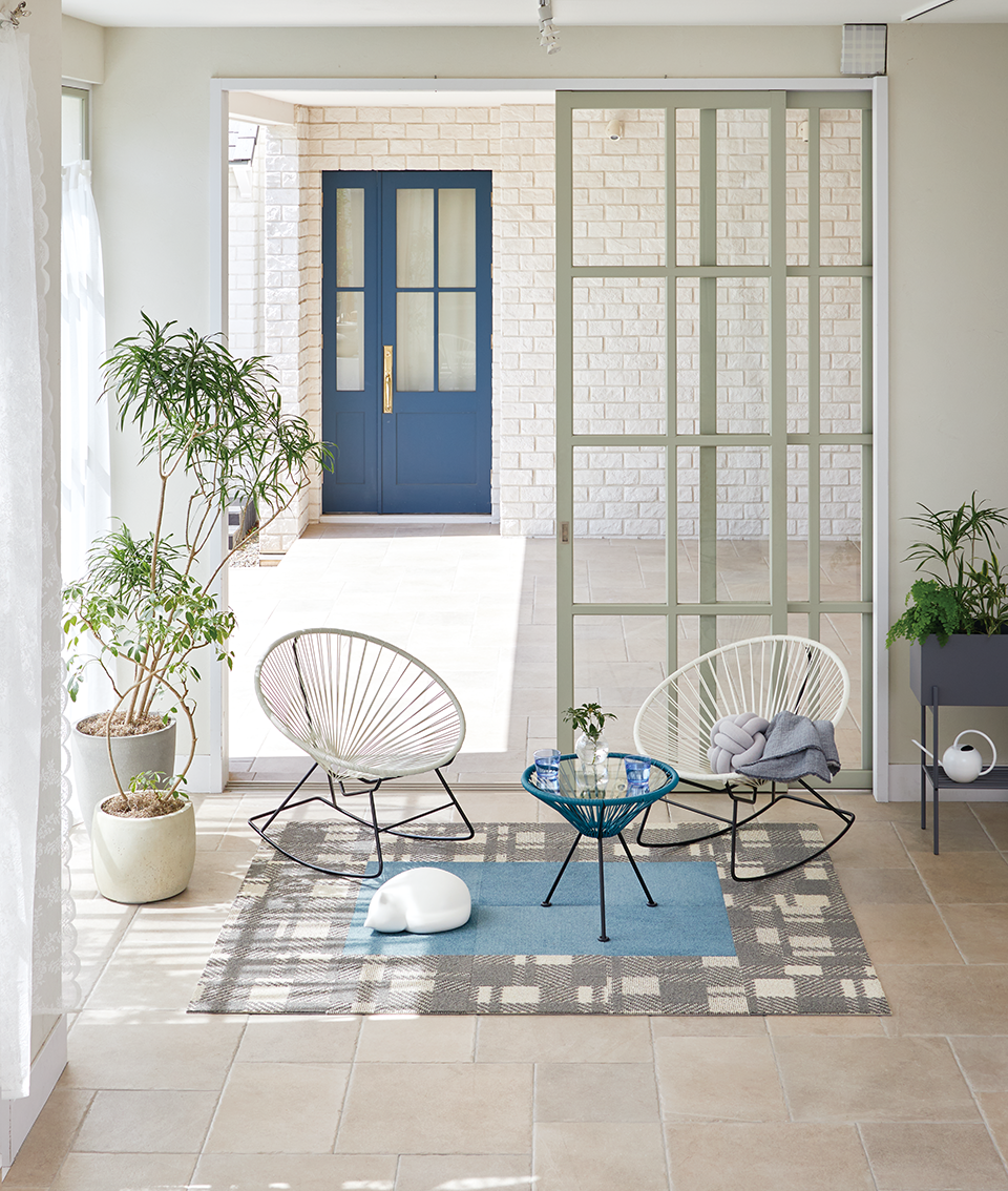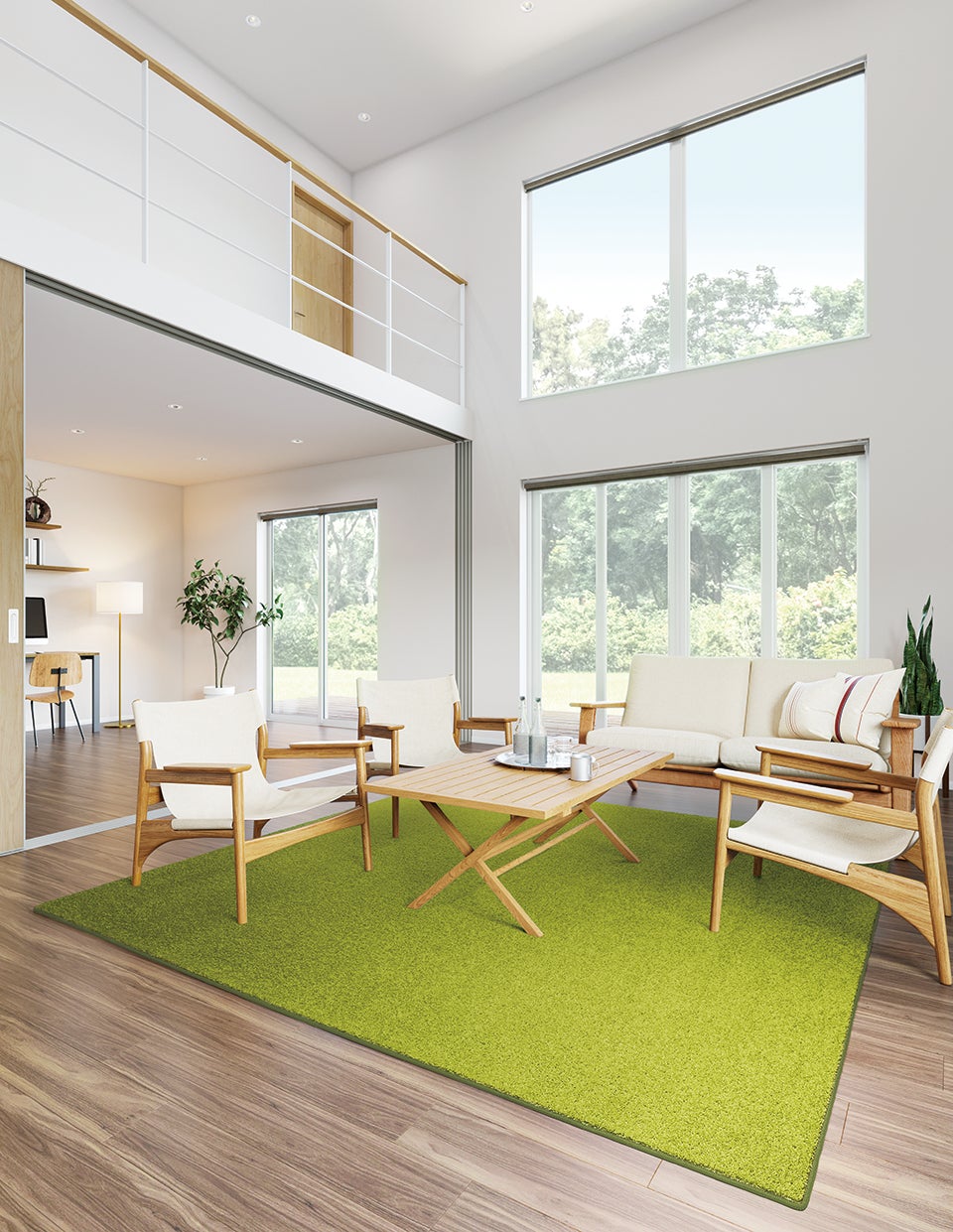 芝のようなグリーンが特徴的。色や毛足の長さ、質感によりアウトドアリビングのようなインテリアを楽しむことができます。