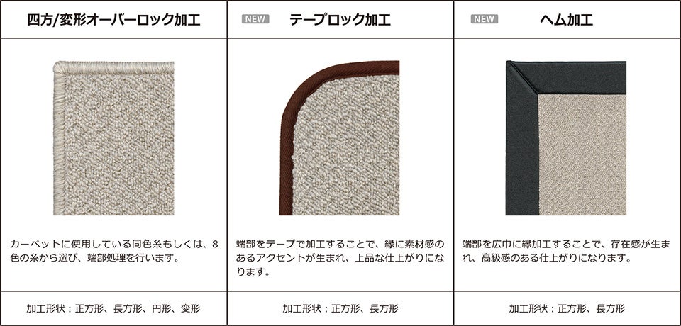 従来の住宅におけるロールカーペットは、“職人が施工し敷き詰める”という使い方がほとんどでしたが、同見本帳では、“自分で敷き、楽しむ”ことをテーマに、オーダーサイズのラグとしての活用が可能なラインアップとしています。このため、1㎡あたりの標準価格だけではなく、ラグにした場合の参考価格を提示するとともに、ラグの施工例写真も豊富に掲載し、ユーザーのイメージをサポートできる構成としました。特に、ラグでの活用を想定した新柄“サンスコッチ”には、下地を傷つけにくく、敷き込みと置敷き両方に適した裏面素材“ハイブリッドバック”を新たに採用しており、より幅広いシーンに対応できる新商品です。また、同見本帳より縁加工の種類を「オーバーロック加工」「テープロック加工」「ヘム加工」の3種類から選べるようになり、同じラグでも縁加工の違いによる表情の変化を楽しんでいただけます。