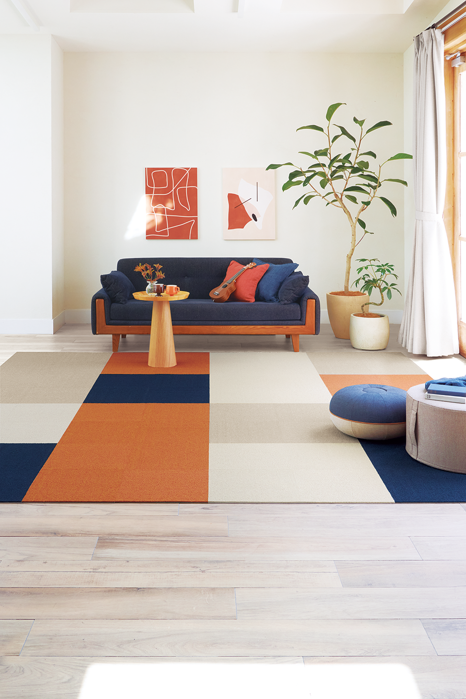 同見本帳では、部屋全体に敷き詰めるだけではなく部分的に敷くラグとしての活用例や、自分で組み合わせを楽しむ置敷きカーペットタイルを拡充しています。エンドユーザーが自らお好みの床材を選び、空間づくりを楽しむことができる、住宅空間にうれしい機能が満載のカーペットを多数ラインアップしています。