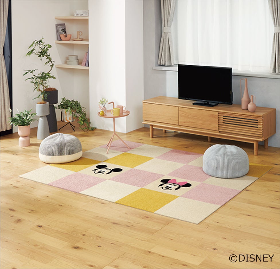 ミッキーとミニーを主役に、優しい印象のカラーを組み合わせた、大好きなキャラクターと一緒のリビング。