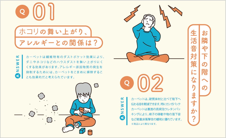 ロールカーペットなど繊維系の床材には、繊維特有の“ダストポケット効果”により、歩行によるホコリやハウスダストの舞い上がりを抑える効果があります。さらに、カーペットをこまめに掃除することで、アレルギー原因物質の発生や影響の抑制が期待できます。また、高い遮音性による生活音の緩和や、やわらかく温かな踏み心地といった、暮らしの快適さと安心感につながる機能を持っています。