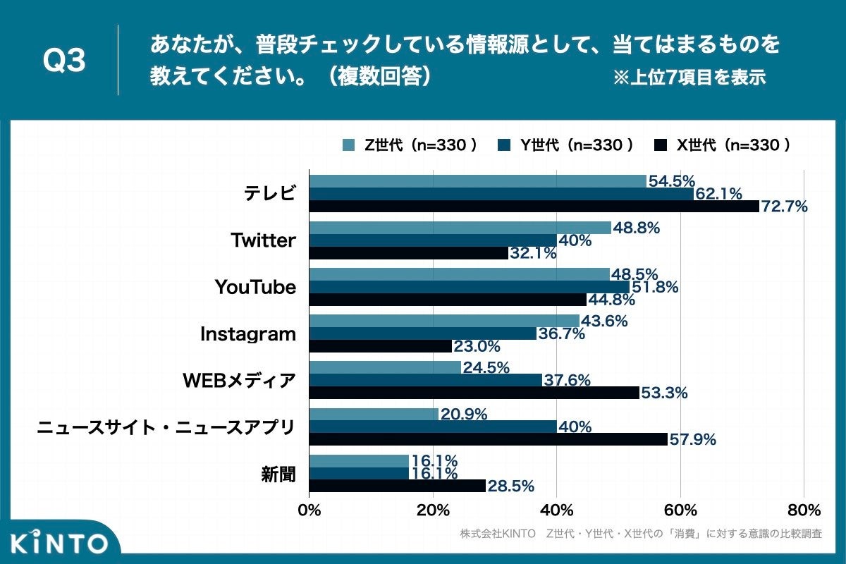 Q3. 普段の情報源、全世代でテレビが最多、次いでZ世代はTwitter、Y世代はYouTube、X世代はニュースサイト・アプリという結果に