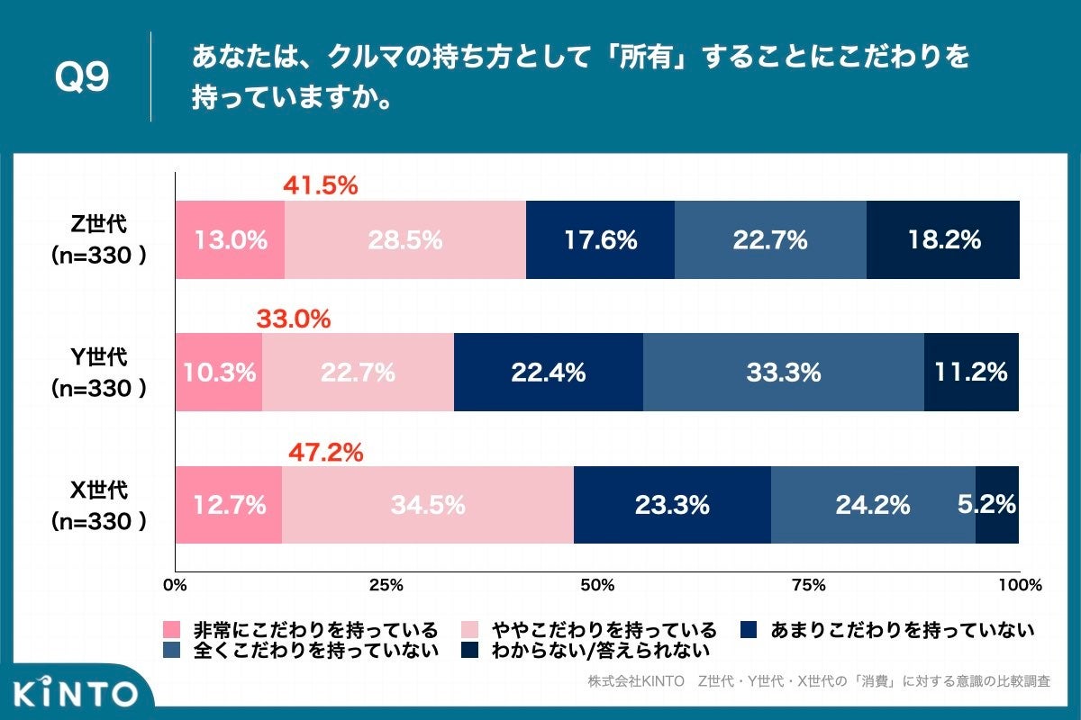 Q9. 車の「所有」へのこだわり、X世代は約半数に対し、Y世代は約3割、Z世代は約4割という結果に