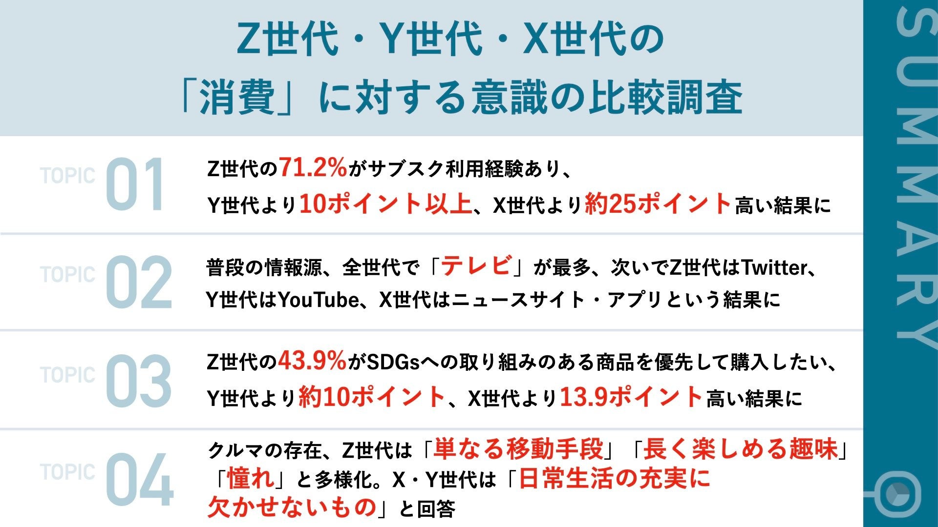 まず、サブスク利用の経験に関しては、Z世代が71.2%となり、Y世代より10ポイント以上、X世代より約25ポイント高く、サブスクリプションサービスの拡大により、特に若い世代でモノは「所有」から「利用」する時代へ移行しつつあることがうかがえます。また、普段の情報源に関しては、全世代でテレビが最多となり、次いでZ世代はTwitter、Y世代はYouTube、X世代はニュースサイト・アプリという結果となりました。