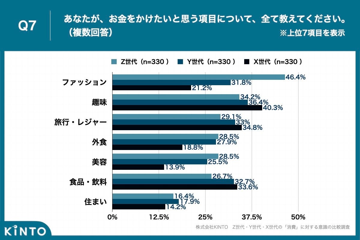 Q7. お金をかけたいと思うもの、Z世代は「ファッション」が約5割、XY世代は「趣味」が約4割でそれぞれ最多
