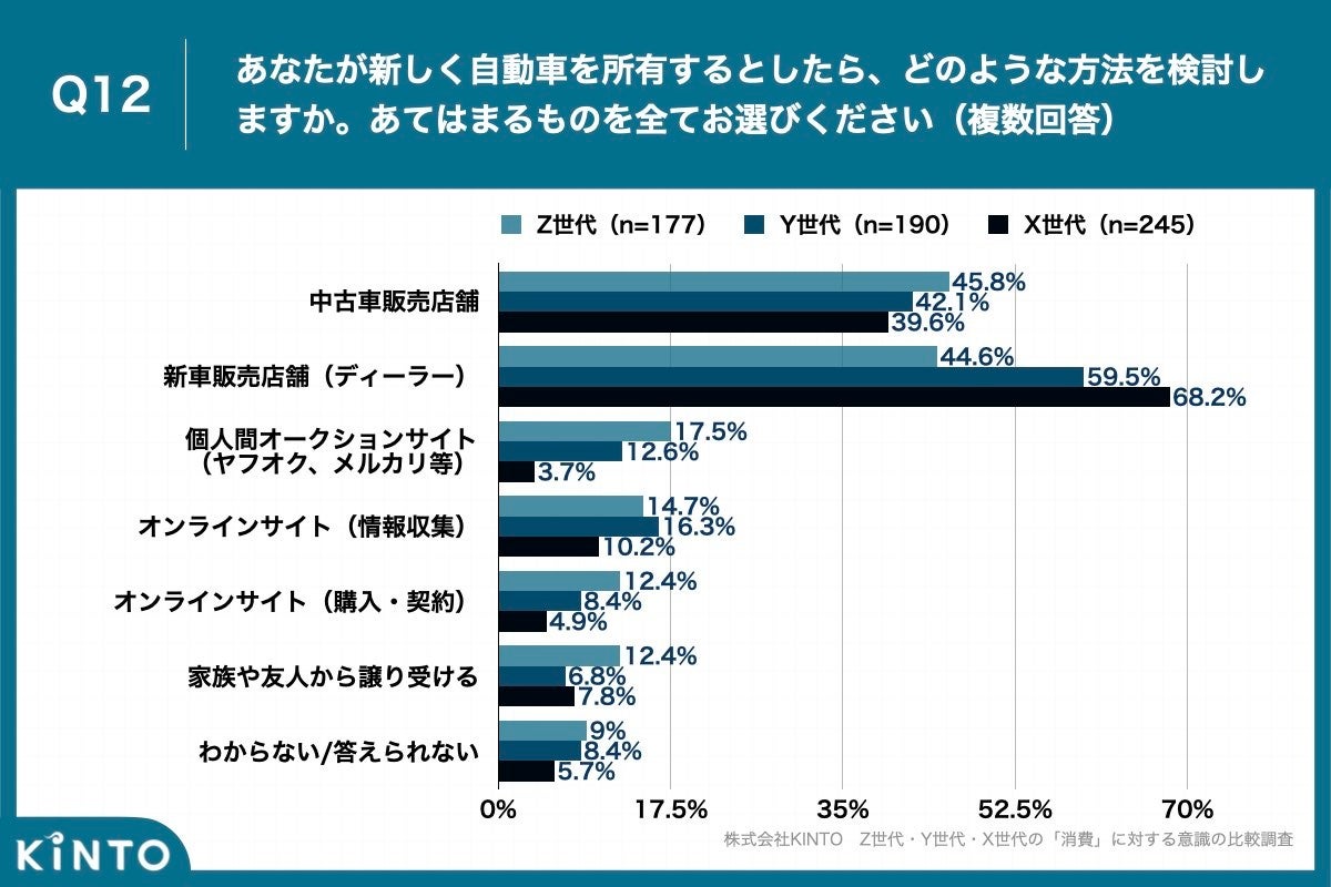 Q11で「わからない/答えられない」「一度も所有したことがない」以外を回答した方に、「Q12.新しく自動車を所有するとしたら、どのような方法を検討しますか。」と質問したところ、Z世代は「中古車販売店舗」が45.8%、「新車販売店舗(ディーラー)」が44.6%、Y世代は「新車販売店舗(ディーラー)」が59.5%、「中古車販売店舗」が42.1%、X世代は「新車販売店舗(ディーラー)」が68.2%、「中古車販売店舗」が39.6%という回答となりました。
