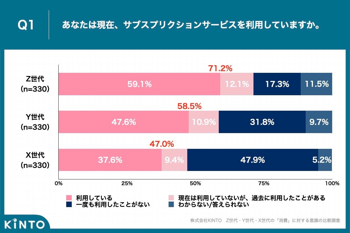 Q1. Z世代の71.2%がサブスク利用経験あり、Y世代より10ポイント以上、X世代より約25ポイント高い結果に