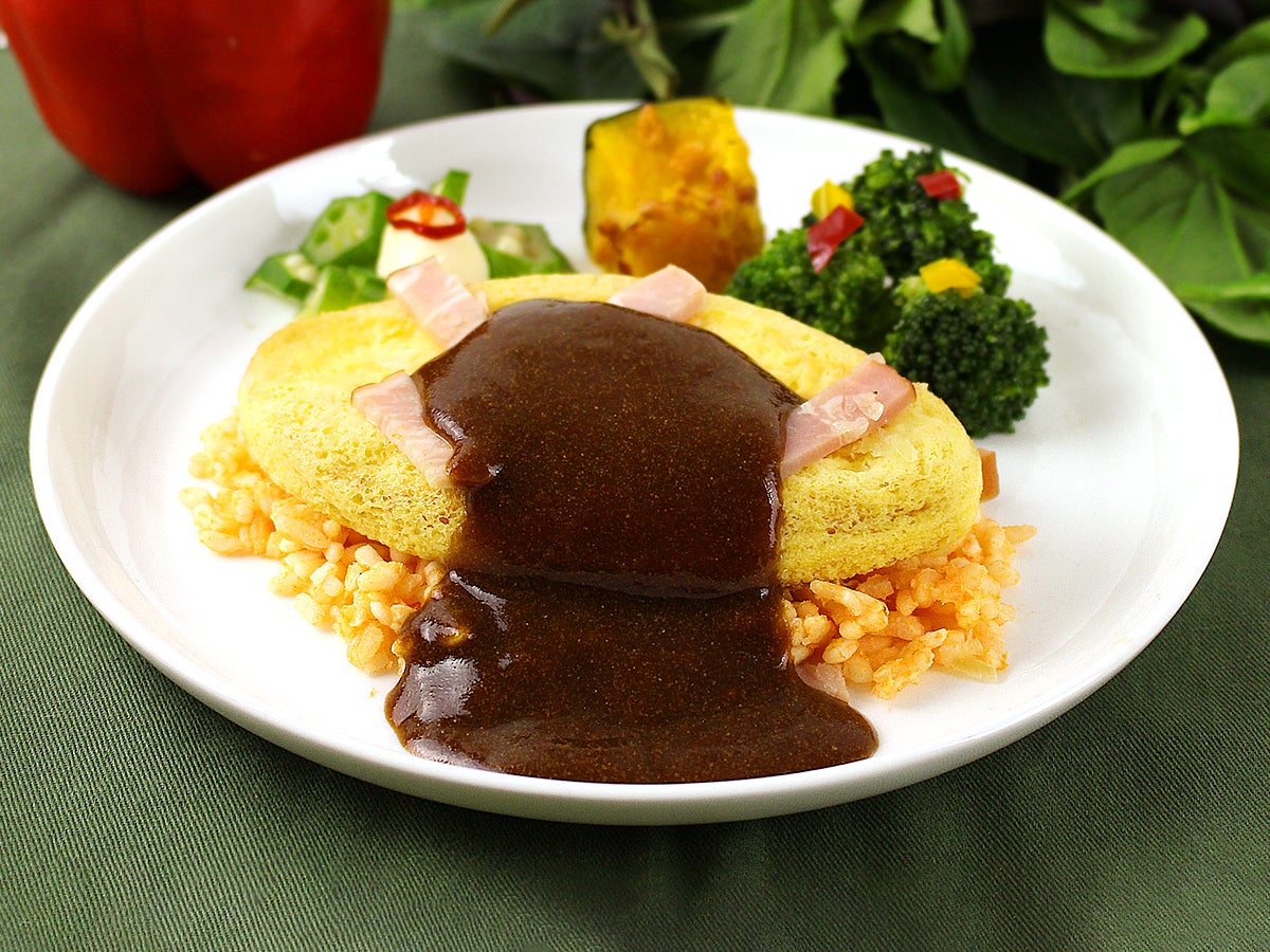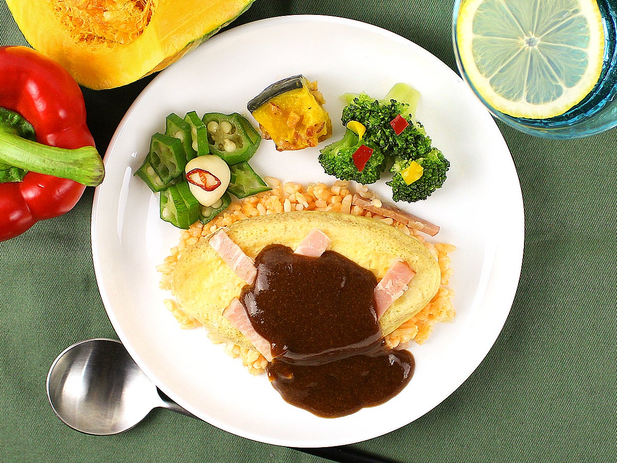 王道のケチャップライスを使った昔ながらのオムライスです。ベーコン、玉ねぎ、オムレツを一緒にお召し上がりください。ソースはナッシュオリジナルの濃厚なデミグラスソースをたっぷりとかけています。