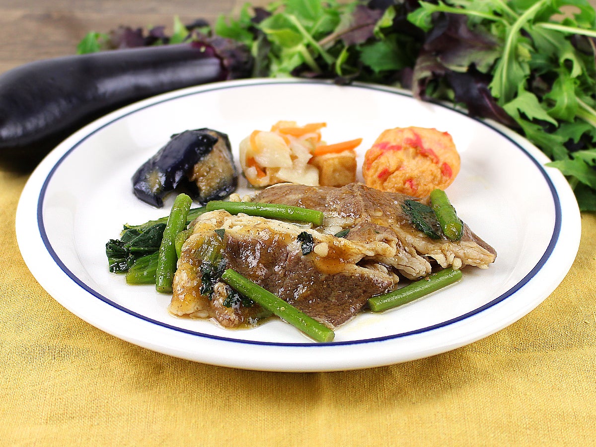 塩麹で優しく下味をつけた豚肩ロース肉を、ポークチャップに仕上げました。コクのある赤ワインソースと爽やかなトマトソースがブレンドされており、キレのある味付けになっています。アスパラ、玉ねぎ、マッシュルーム、パプリカが入っており、野菜もしっかりと食べることができます。懐かしい洋食屋さんを思わせるプレートです。