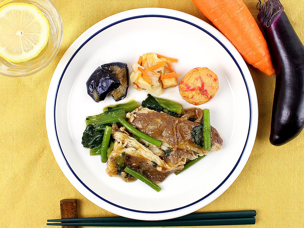 副菜は、揚げなすのソースがけ、白菜と人参の厚揚げ、紅生姜天です。