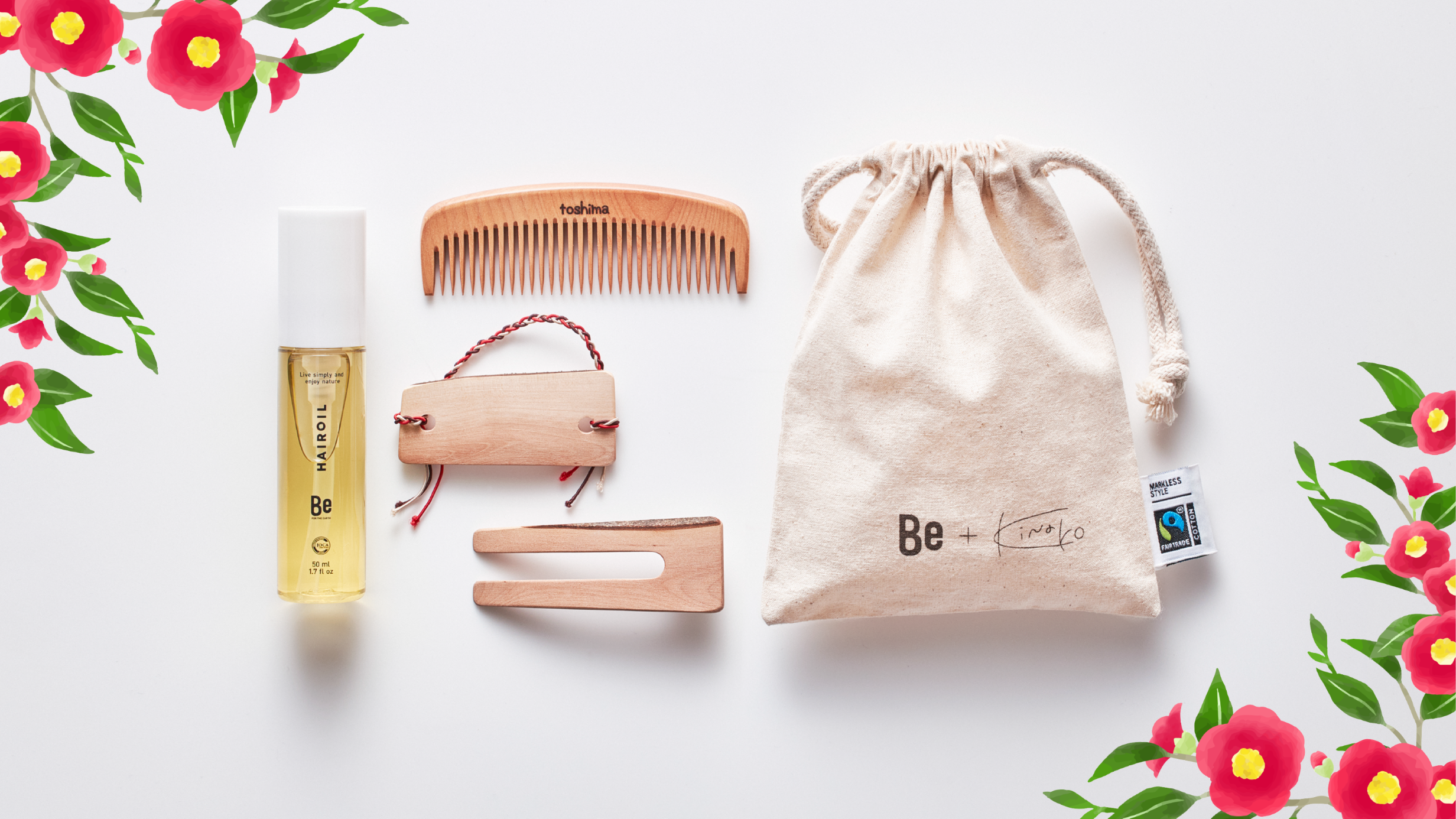 東京・利島が育んだ藪椿から抽出したツバキオイルをはじめ、ブロッコリーオイル、ひまわりオイルなど潤いに満ちた毛髪と健やかな頭皮を目指す天然成分100%の「Beオーガニックヘアオイル」と、同じく利島産薮椿の「間伐材」から仕立て、櫛の生産地として知られる大阪・和泉の職人が歯1本1本を研磨して椿油で仕上げた、使えば使うほどに髪にツヤが出る椿櫛。また、アップサイクルなモノづくりを取り組む、アクセサリーブランド『KiNaKo』とのコラボヘアアクセサリーがセットになった、ヘアケアだけでなく浴衣を着るシーンや、夏のまとめ髪などヘアアレンジまで楽しめる限定セットとなっております。