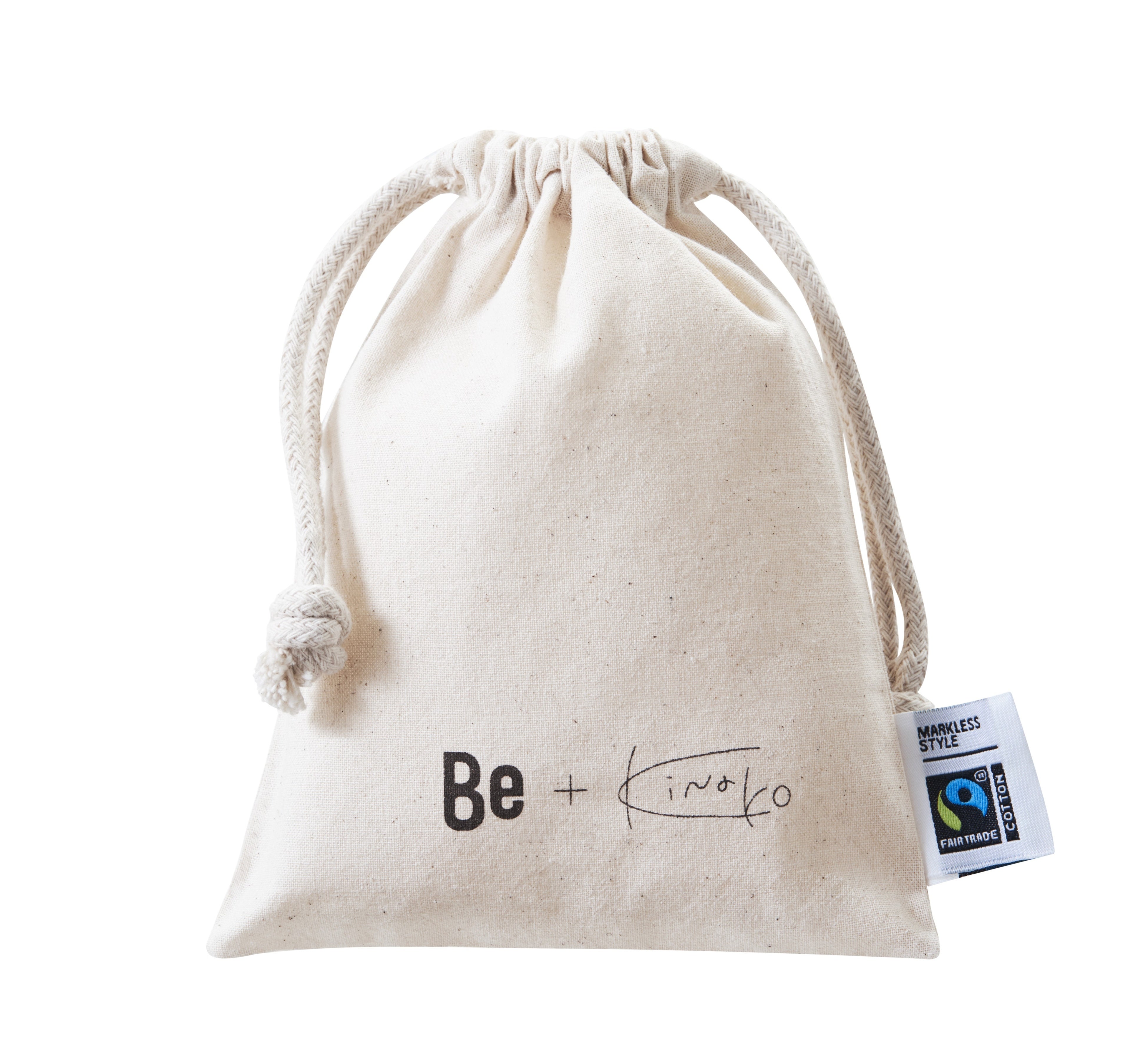 コラボレーション限定デザインのオリジナル巾着。100%フェアトレードコットン使用で肌触りも良く、有機農地拡大につながる素材です。