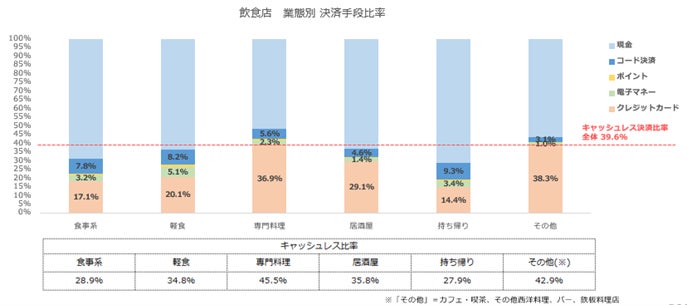 ・業態別のキャッシュレス比率では、専門料理の45.5%、その他で42.9%を占めている。