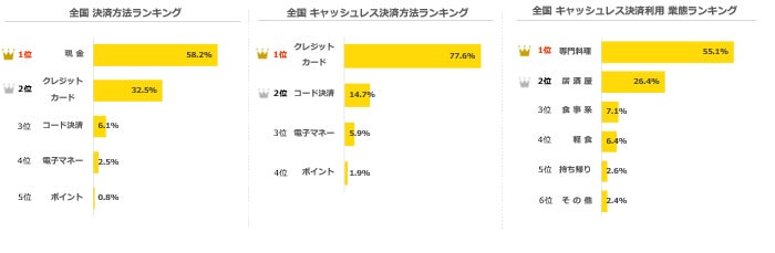 全国での決済方法では、現金が最も多く58%を占め第1位、クレジットカードが32.5%で第2位。