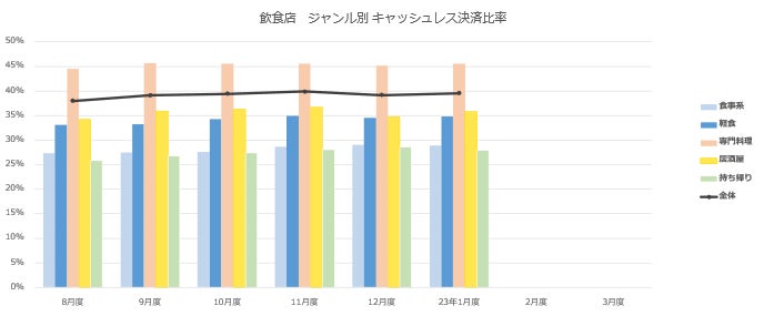 ・飲食店全ジャンルのキャッシュレス決済比率はほぼ横ばいが続いている。