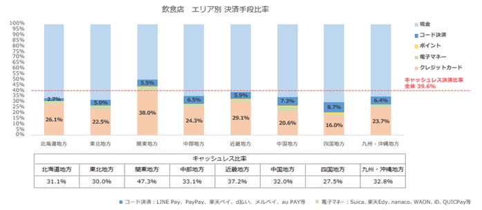キャッシュレス決済比率が最も高い関東地方は、クレジットカード決済が全国平均の32.5%を上回り39.3%。