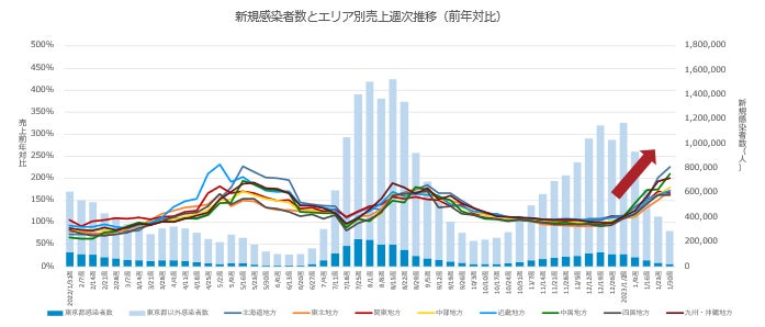 第8波が収まった影響により、前年対比では4か月ぶりに大きく回復。コロナ前(2019年)対比では130%である。売上の前年対比は1月に入ってから大きく回復。第8波が懸念されたものの第7波ほど新規感染者数が伸びなかったことが要因と考えられる。2023年5月より新型コロナウイルスが第5類に移行されることに伴い、今後より伸びていくことが予想される。