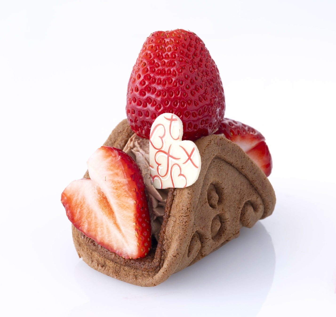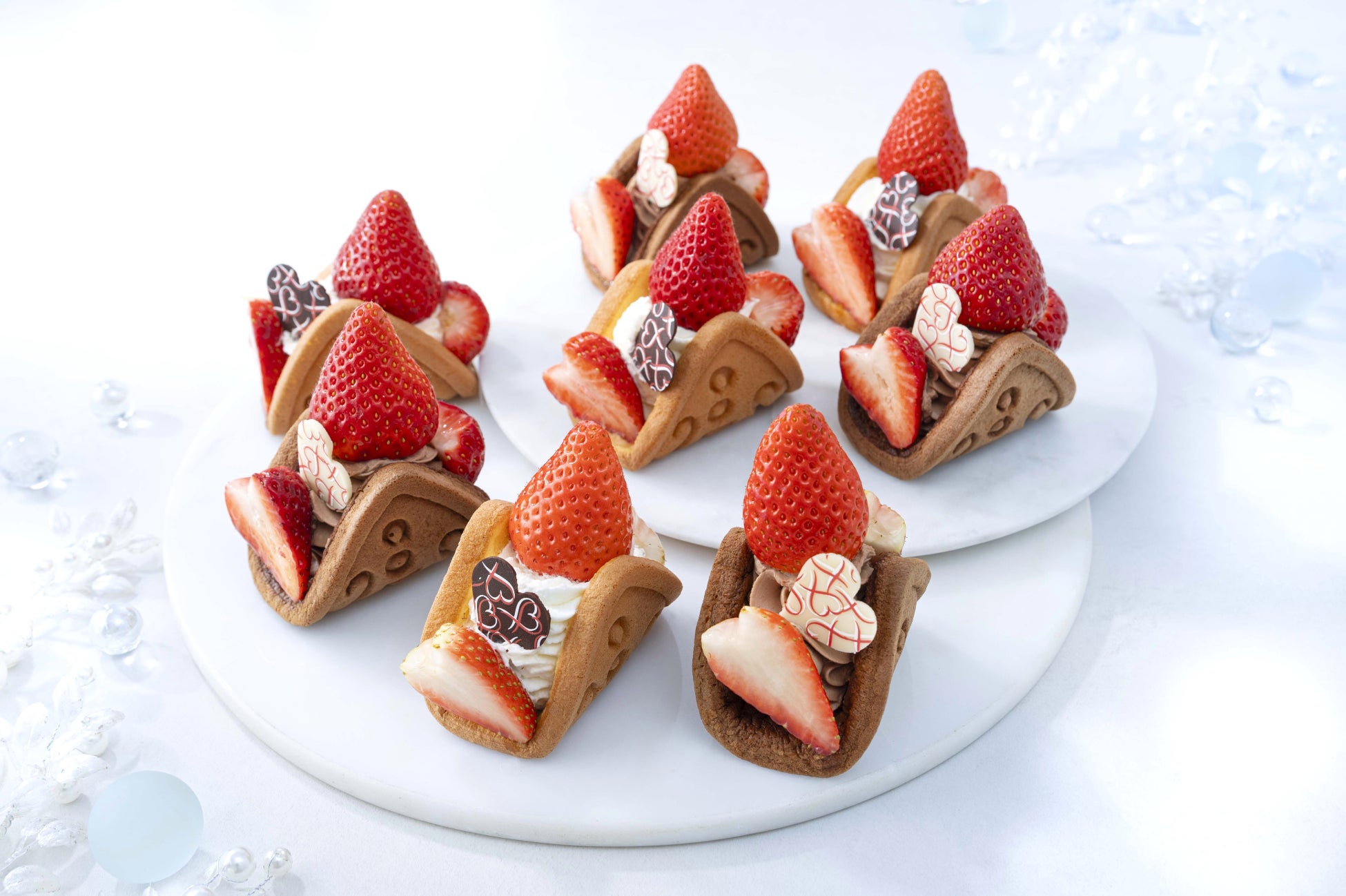 全国各地から集めた旬のいちごを一堂に集結させました。市場に出回らない希少品種や高級品種など、味自慢の人気いちごをふんだんにのせています。ハーフカットされたいちごはバレンタインらしくハート形にカットし彩りを添えています。