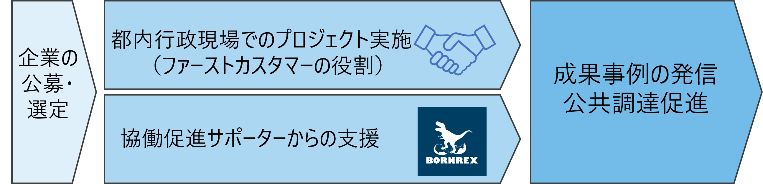 東京の抱える社会課題の解決につなげるプロジェクトを都内行政現場で行い、東京都がファーストカスタマーの役割を担うことで、スタートアップのプロダクトやサービスの普及拡大を図ります。さらに、東京都との協働、プロダクト・サービス導入をきっかけに、スタートアップがグローバルに活躍する企業へと大きく成長し、後続するスタートアップのロールモデルとなるような「キングサーモン企業」の輩出につなげることを目指します。