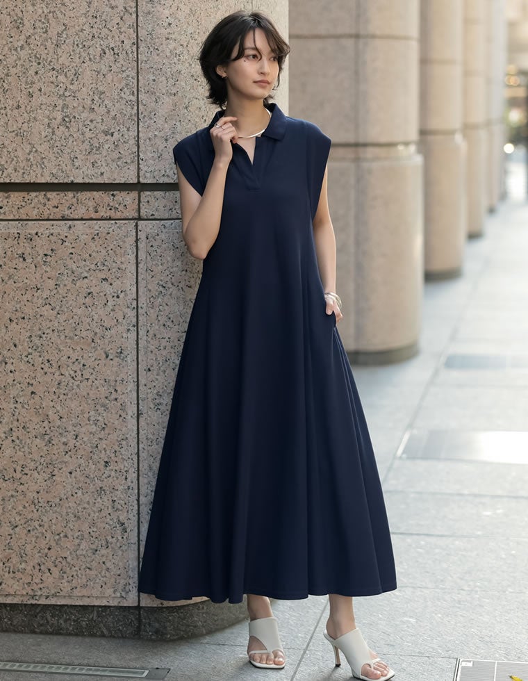 キーネックフレンチスリーブポロワンピース