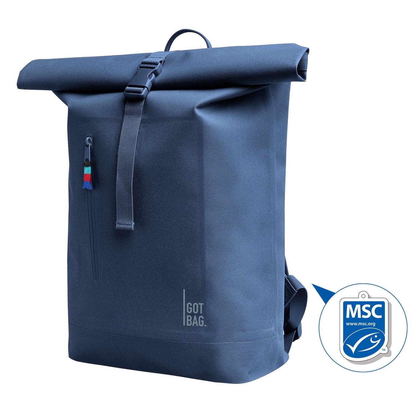 海洋廃棄プラスチックを再利用して生産されたドイツブランドのバックパックです。リサイクル素材のアクリルを使用したMSC「海のエコラベル」の特製チャーム付き。