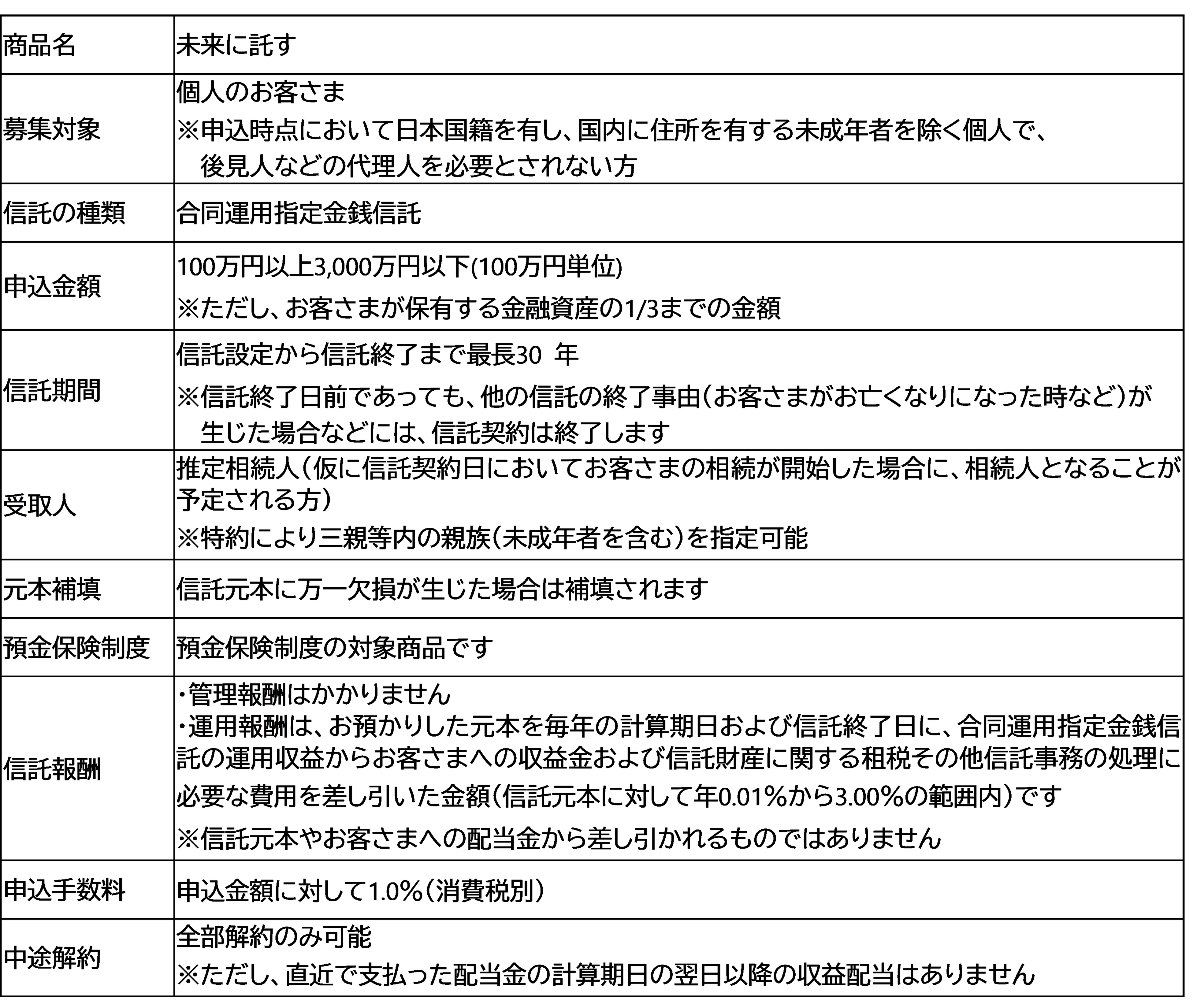 遺言代用信託とは、遺言書を作成いただくことなく、お客さまに相続が発生した際に、お預かりした金銭をあらかじめ指定いただいたご家族などの受取人にお渡しする商品です。