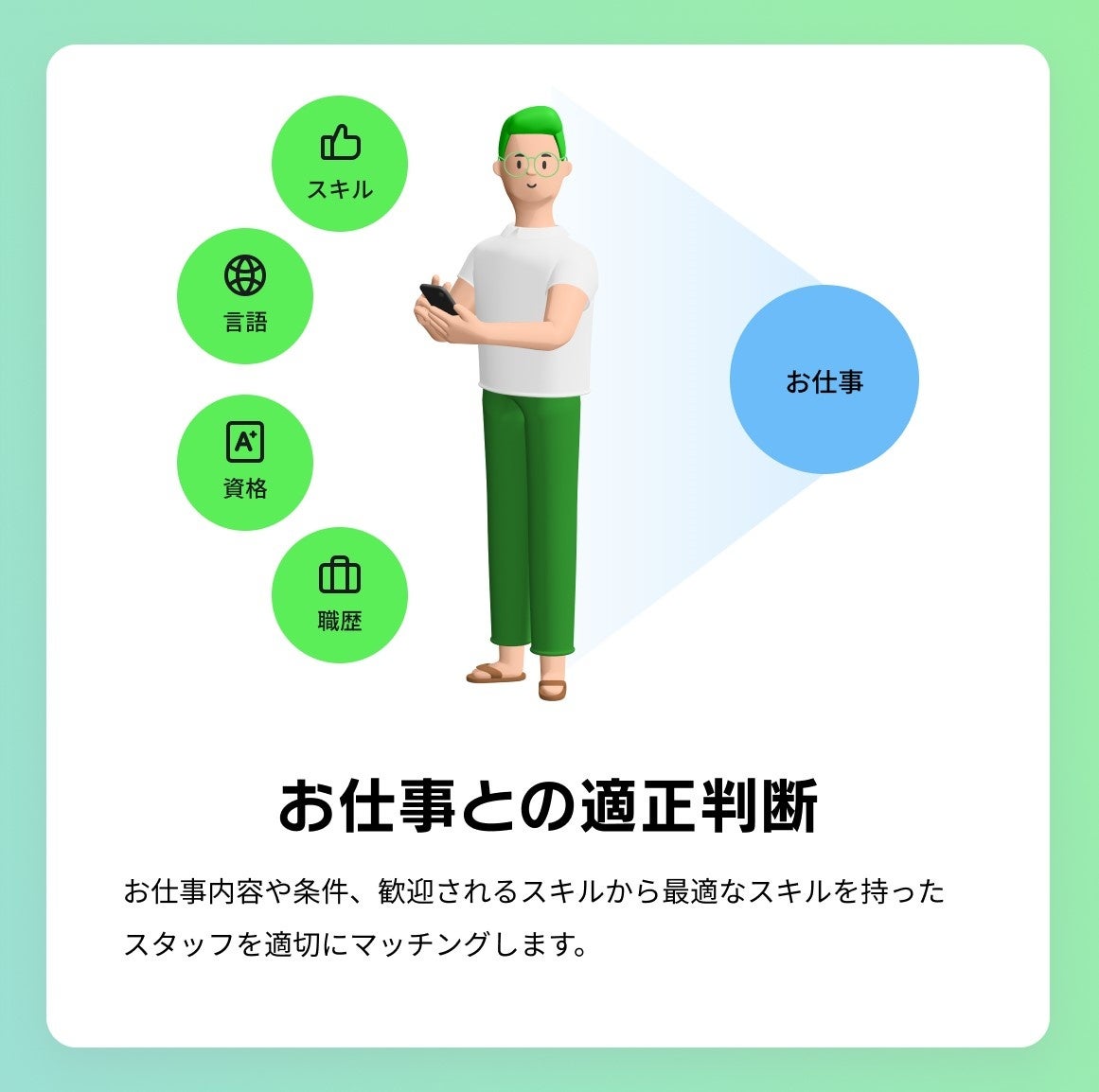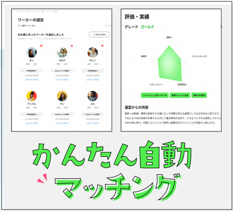 メタジョブでは、これら登録スタッフごとに、コミュニケーション能力などの適性や勤務実績をデータベース化。独自開発したデジタルワーク専用のアルゴリズムのもと、案件に応募したスタッフの中から、企業側の要望や条件との適合が高い人をおすすめ表示します。