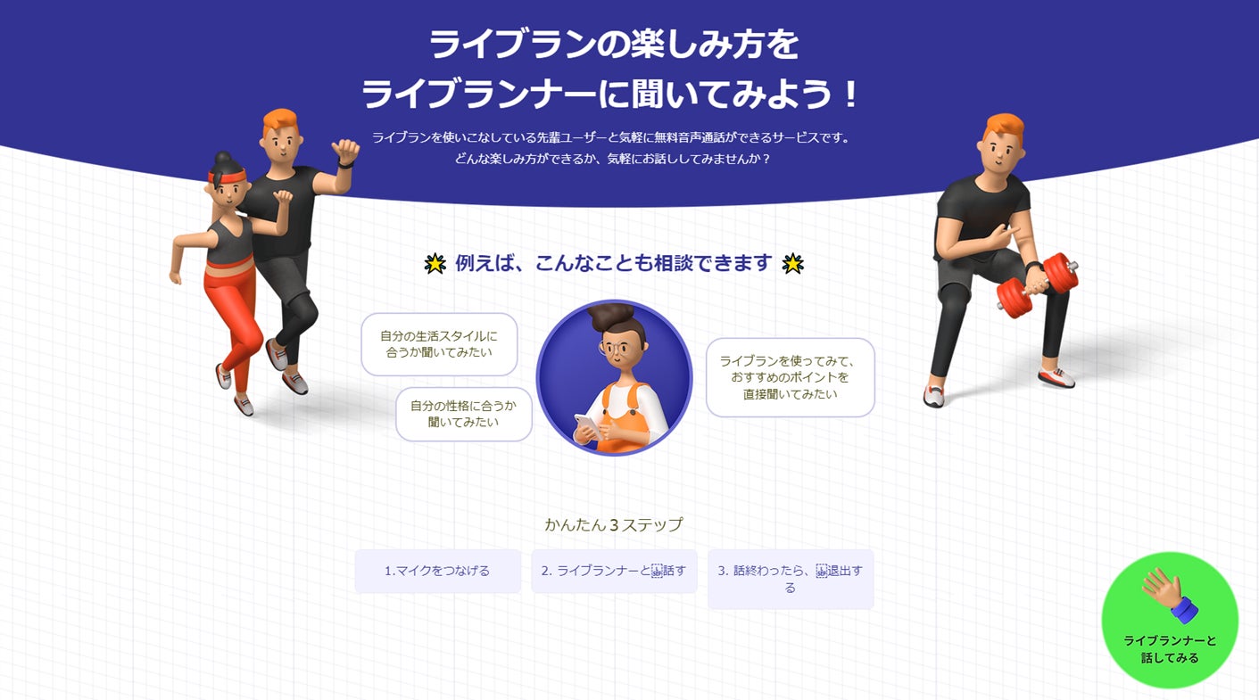 サポート内容:"生実況付き運動アプリ「ライブラン」”に、オンライン雑談型接客システムを導入。サイト情報や口コミだけでは伝わりにくいリアルな使用感や日常生活での利用イメージを湧かせる会話でCVRに大きく貢献。アカウント作成数が前月より48%増加するなど、多くの反響を得た。