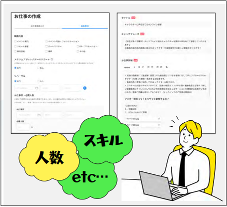 案件概要・日時・人数・リハーサルの有無などをシステムに入力するだけでOK。この時点で、概算見積の確認も可能です。掲載後はメタジョブ!登録スタッフが案件へ応募できるようになります。
