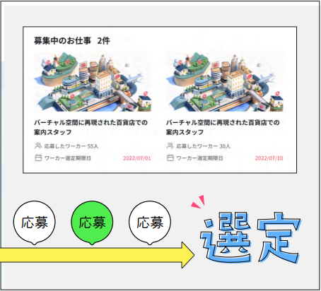 例えば、メタバースイベントのスタッフ募集では、メタバースが初めてで不慣れな参加ユーザーも徹底サポート出来るように“メタバースに明るいスタッフや接客経験のあるスタッフ”をおすすめ表示。このように案件ごとに最適なスタッフのマッチングが手軽にできます。