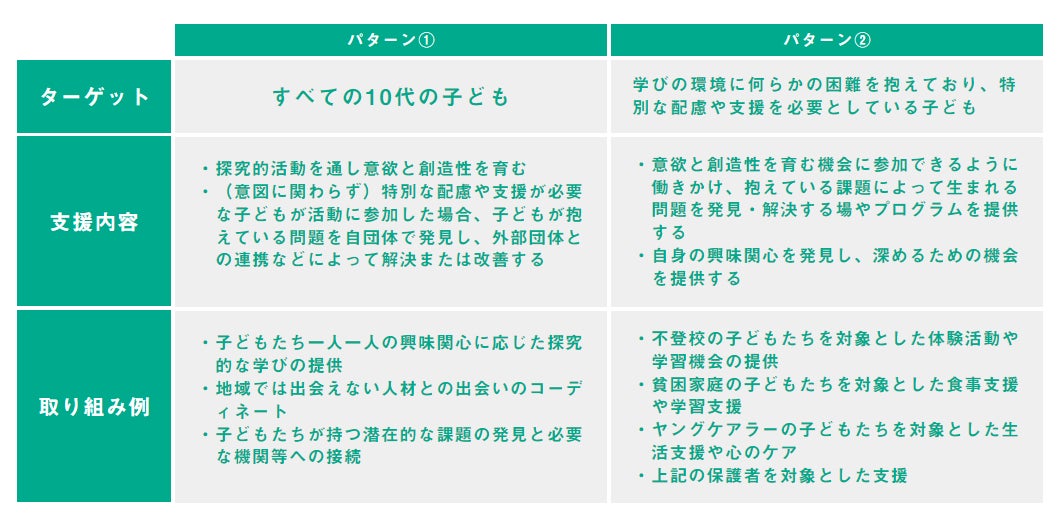 10代(小学校高学年から中高生を想定)に継続的に居場所や対話の機会を提供しながら、以下のパターン①・②いずれかまたはその両方に取り組む事業