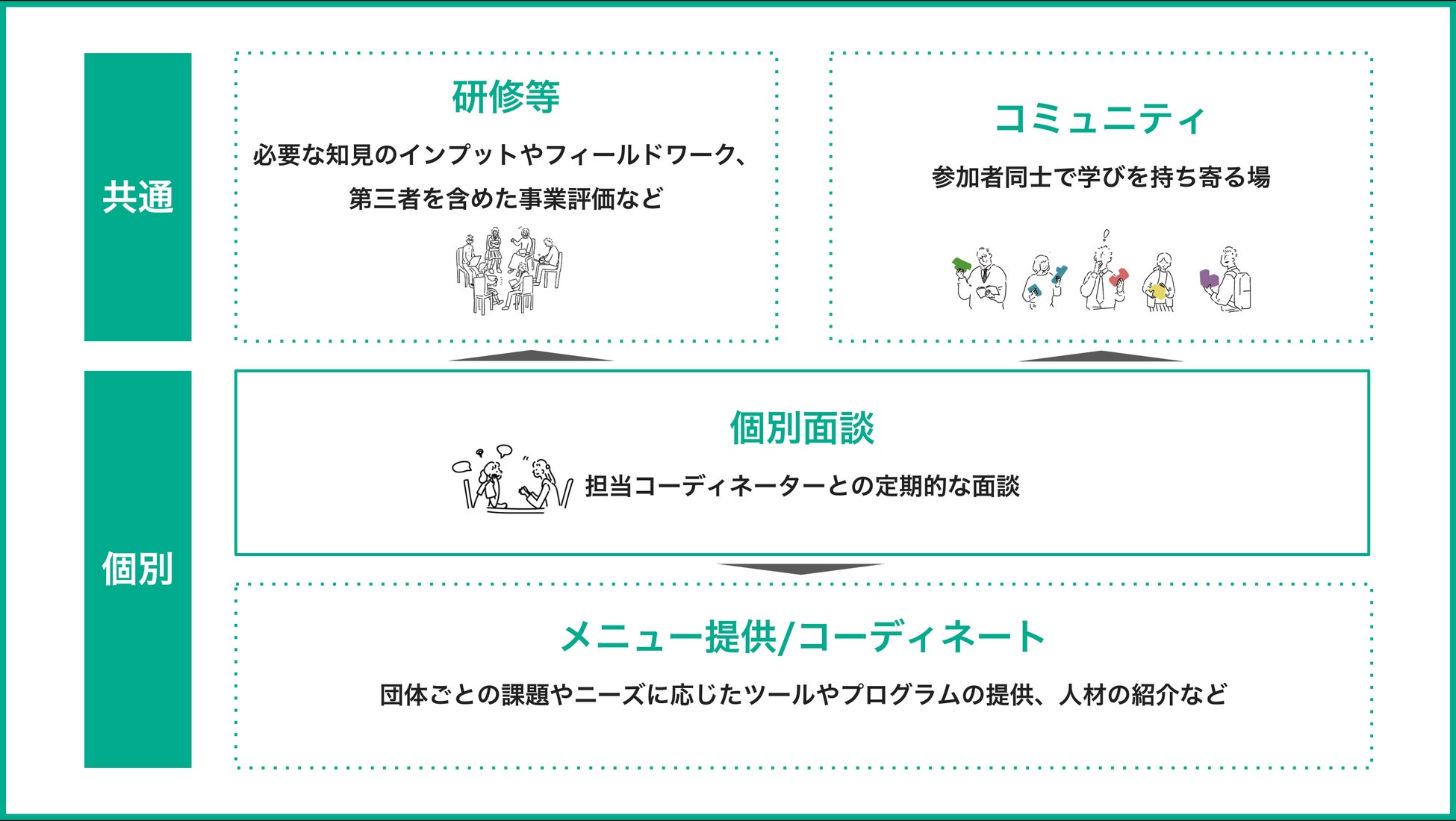 担当コーディネーターによる定期的な面談(個別面談)を軸に、研修等の実施やコミュニティとしての学びの場の提供、団体ごとの課題やニーズに合わせたメニュー提供やコーディネートなどの支援を行います。