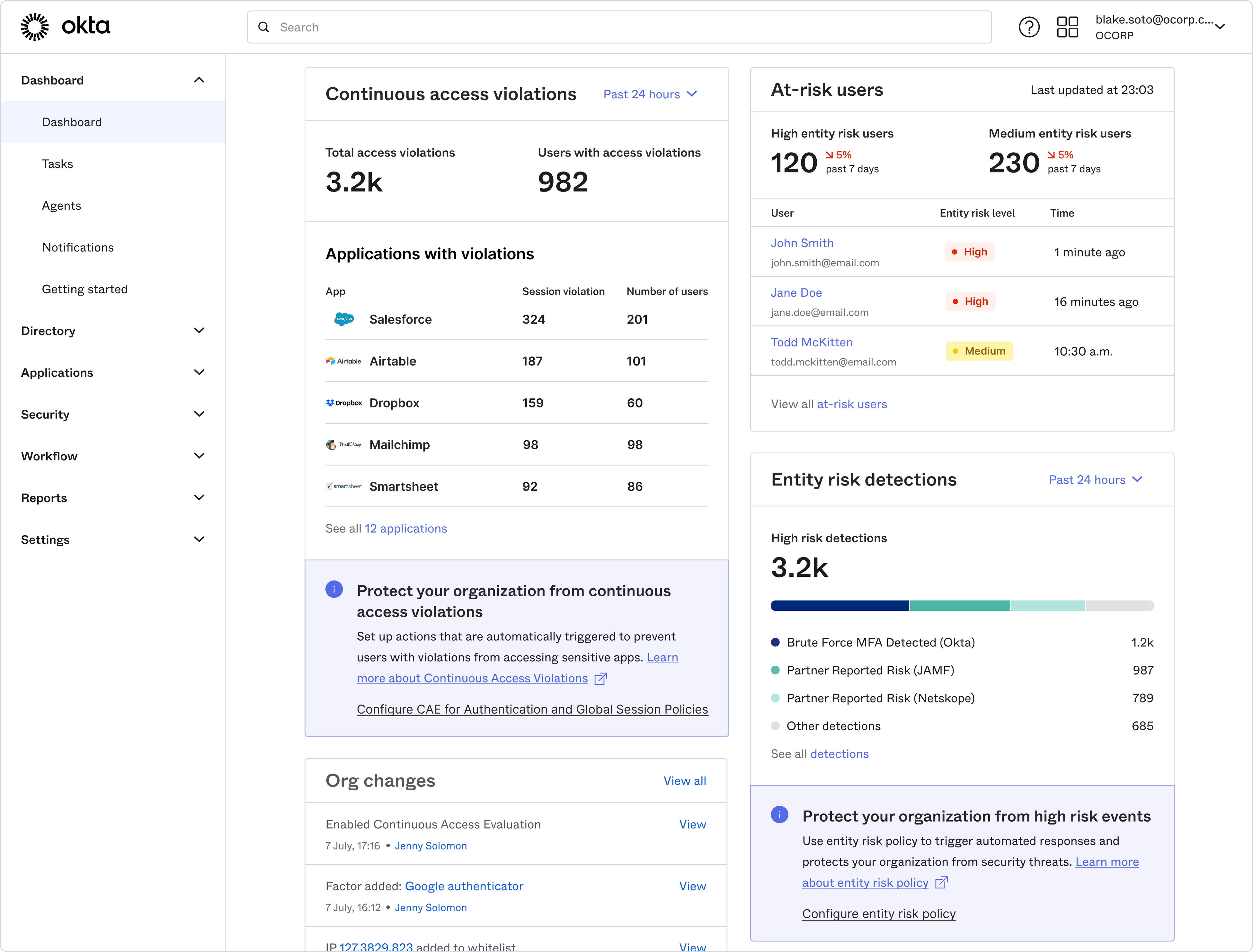 組織は、進化する脅威に対応するために、ますます多くのサイバーセキュリティツールを採用するようになっており、管理者やセキュリティチームは、効果的なポリシーを確立し、重要な脅威を検出して対応するために、膨大な量のきめ細かいセキュリティデータを選別することを余儀なくされています。このような断片化は、複数のコンソールをナビゲートすることにつながり、特定のユーザーセッションのリスクを長期にわたって追跡することを困難にしています。Oktaは、アイデンティティを組織のテクノロジースタック全体で統一的に展開するため、セキュリティドメイン全体やアクティブなユーザーセッション全体のリスクを評価することができます。