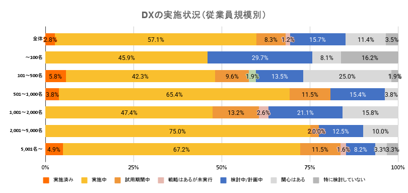 ■DX推進状況:大企業では7割が推進中、企業規模で格差も