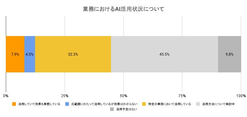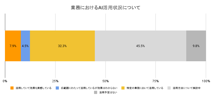 AI活用についての調査では、「活用方法について検討中」が45.5%で最多となり、「特定の業務において活用している」が32.3%と続きました。一方、「活用していて効果も実感している」と回答した企業は7.9%にとどまっており、AIの本格運用や成果実感には依然としてハードルがあることがうかがえます。