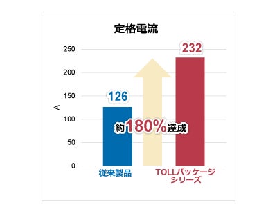 本製品は、新パッケージの採用により実装面積を従来品比※1約25%削減しました。また、シールドゲート構造を採用した次世代チップ搭載により、定格電流は従来品比※2約180%の232Aを達成し、小型化と大電流の両立を実現しています。