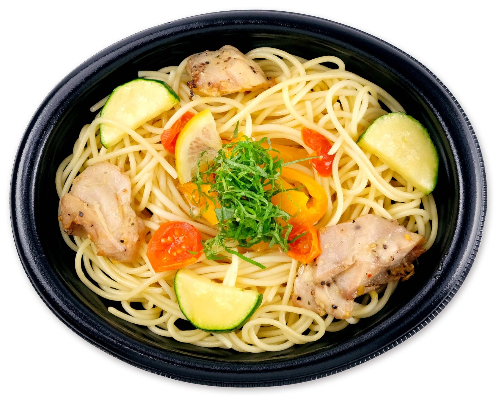 爽やかなレモンの酸味と大葉の風味でさっぱりと食べられる和風ベースのレモンオイルパスタ。チキン・ズッキーニ・黄ピーマン・チェリートマトをトッピングしました。見た目も味わいも夏らしく仕上げました。食欲の落ちやすい季節にもぴったりな、軽やかな一皿です。