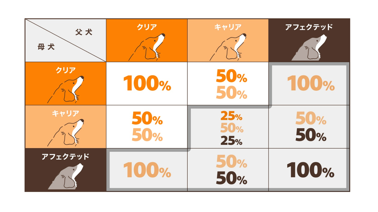 検査の結果、両親がクリア同士、またはクリアとキャリアの組み合わせでない場合は、以下の表の通り、アフェクテッドが生まれる可能性があることから、当該ブリーダーとのダックスフンドの子犬の取引を行いません。