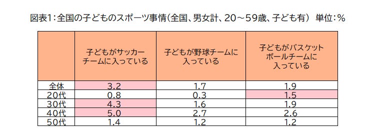 今回当社と日本リカバリー協会が実施した調査によると、サッカーチームに通う子どもを持つ親が、全国で3.2%と、野球やバスケットボールなど他のスポーツに比べて非常に多いことが分かっています。年代別に見ると、50代では3つのスポーツの差は少ないのに対し、30・40代ではサッカーが他に大きく差をつけて多くなっています。30代以下ではバスケットボールが野球を上回っており、20代では、バスケットボールが最も多い結果となりました。