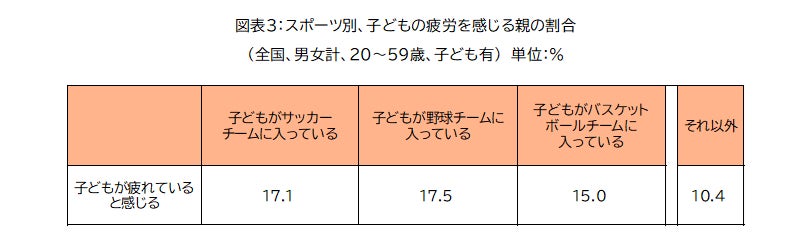 サッカーチームに入る子どもを見て疲れていると感じる親は、野球に次いで多く17.1%
