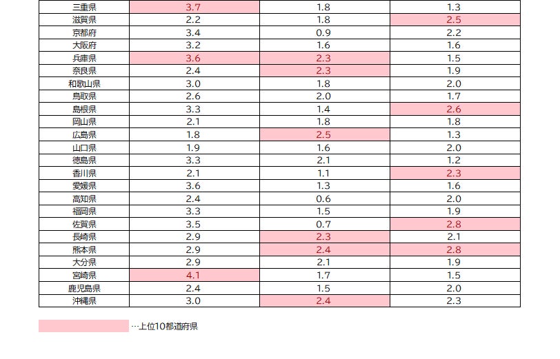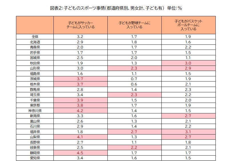 都道府県別に子どもが各スポーツチームに入っている割合を見ると、以下の結果となりました。