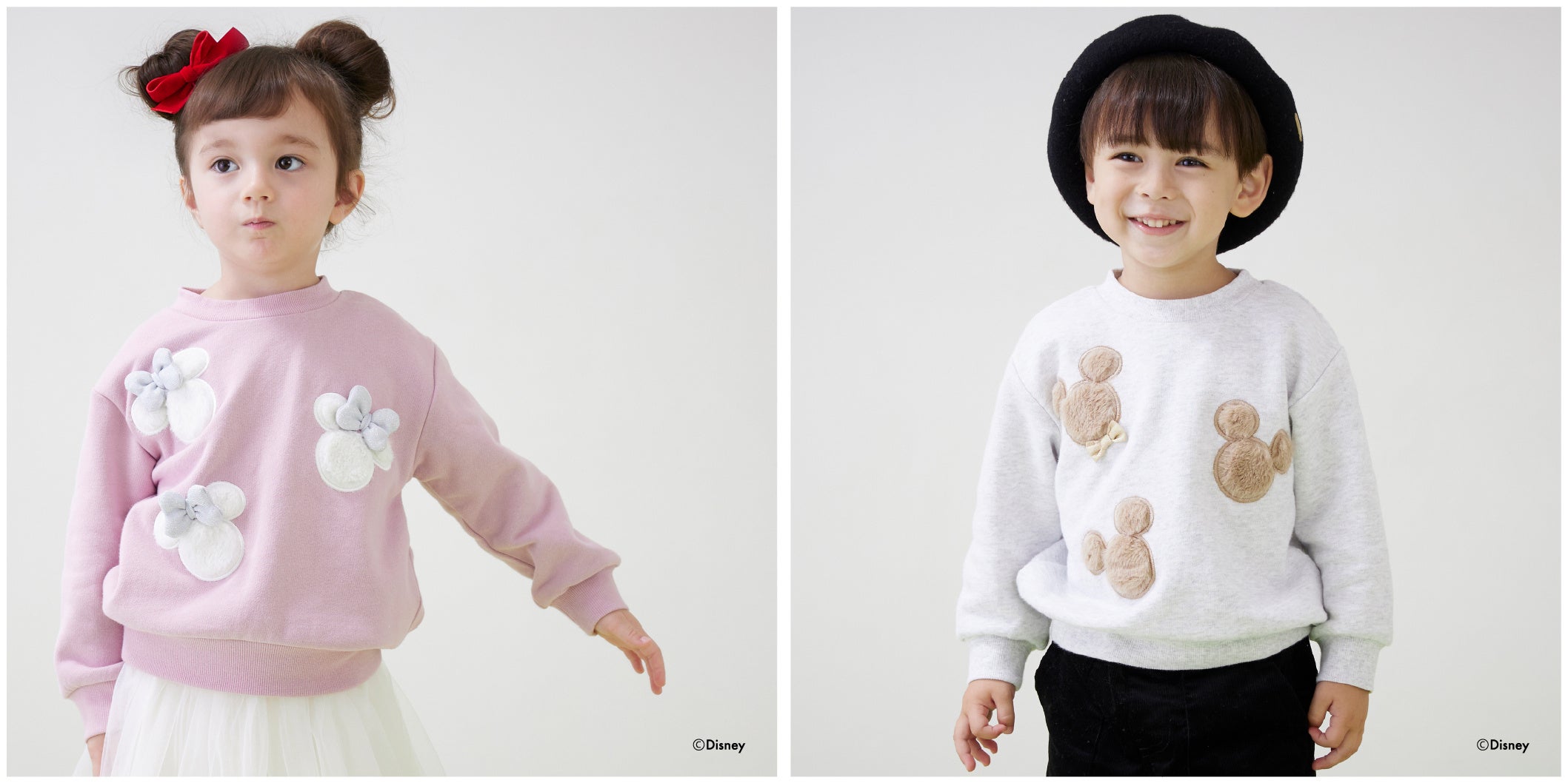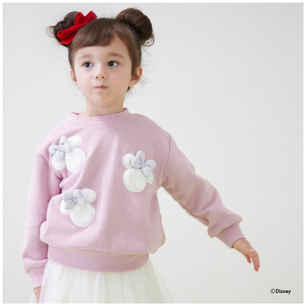 キッズの大好きなミッキーマウス・ミニーマウスのモチーフに、ファーやキラキラなど季節感のある素材を使用した特別感のあるプティマインらしいデザイン。デイリーに着やすいトレーナーでご用意しました。