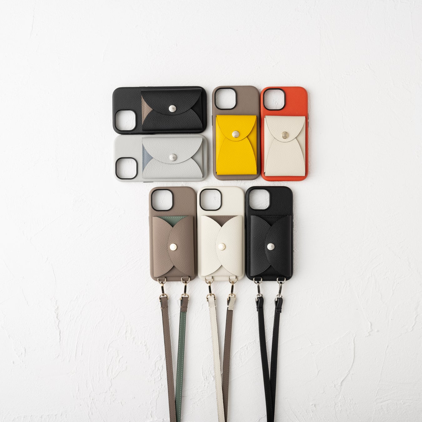 カードケース付iPhoneケース(サイドスロット)は、エンベロップの一部分にのみ異なるカラーを配色し、控え目でさりげないデザインを求める方におススメのモデルです。)尚、こちらのモデルのみストラップ付モデルも登場します。(BLK*BLKのみソリッドカラーでの展開)