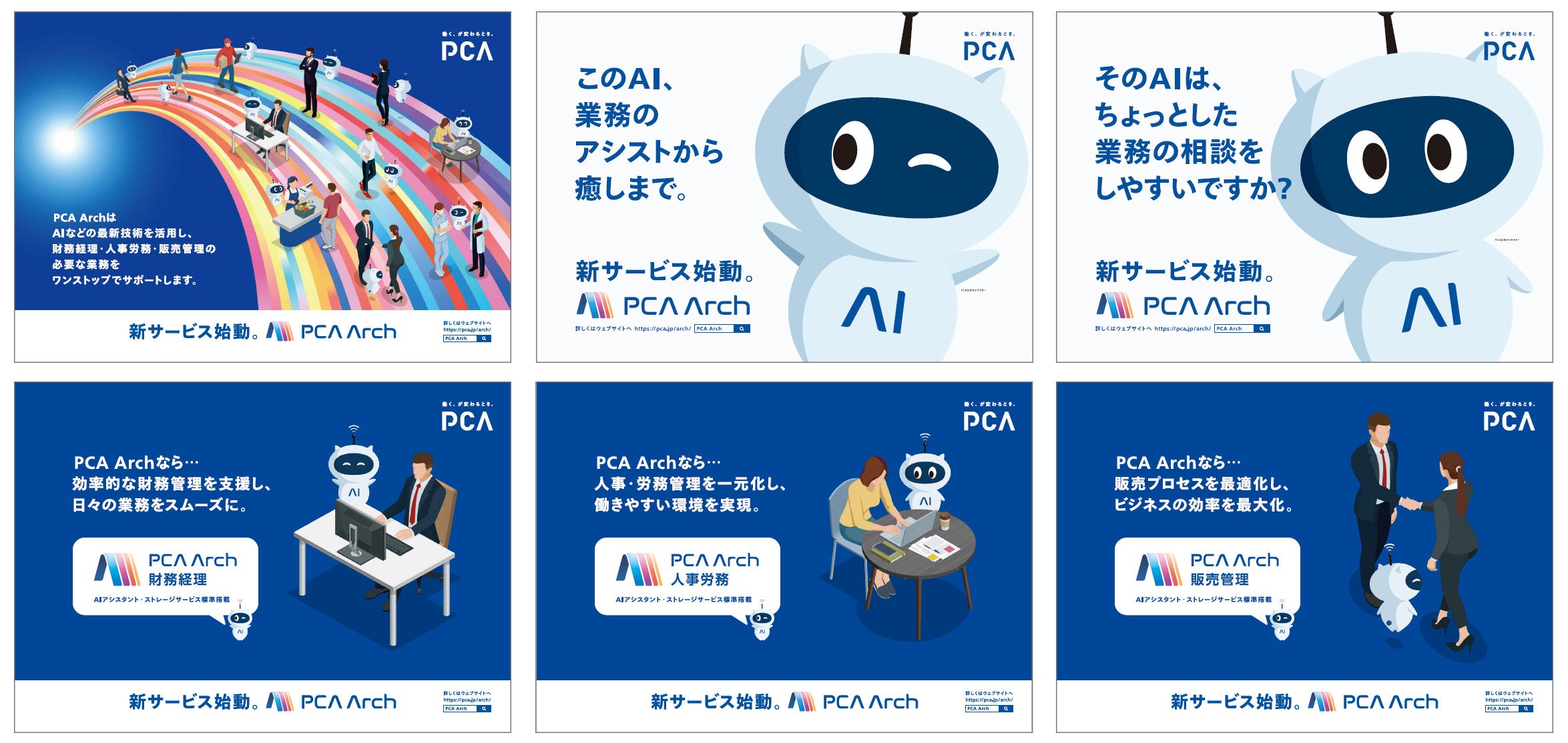 今回の広告では、『PCA Arch』によって、バックオフィス業務に携わる人々が抱えるお悩みを、AIなどを活用して解決のお手伝いができることや、難しいと思われがちなAIは親しみやすいサービスであるということを、イラストによって分かりやすく説明しています。JR東日本首都圏の電車内にデザイン6種が掲出され、可愛いロボットが目を引くポスター広告となっています。首都圏の多くの人が利用するJR東日本への掲出で、さらなる認知拡大を期待しています。
