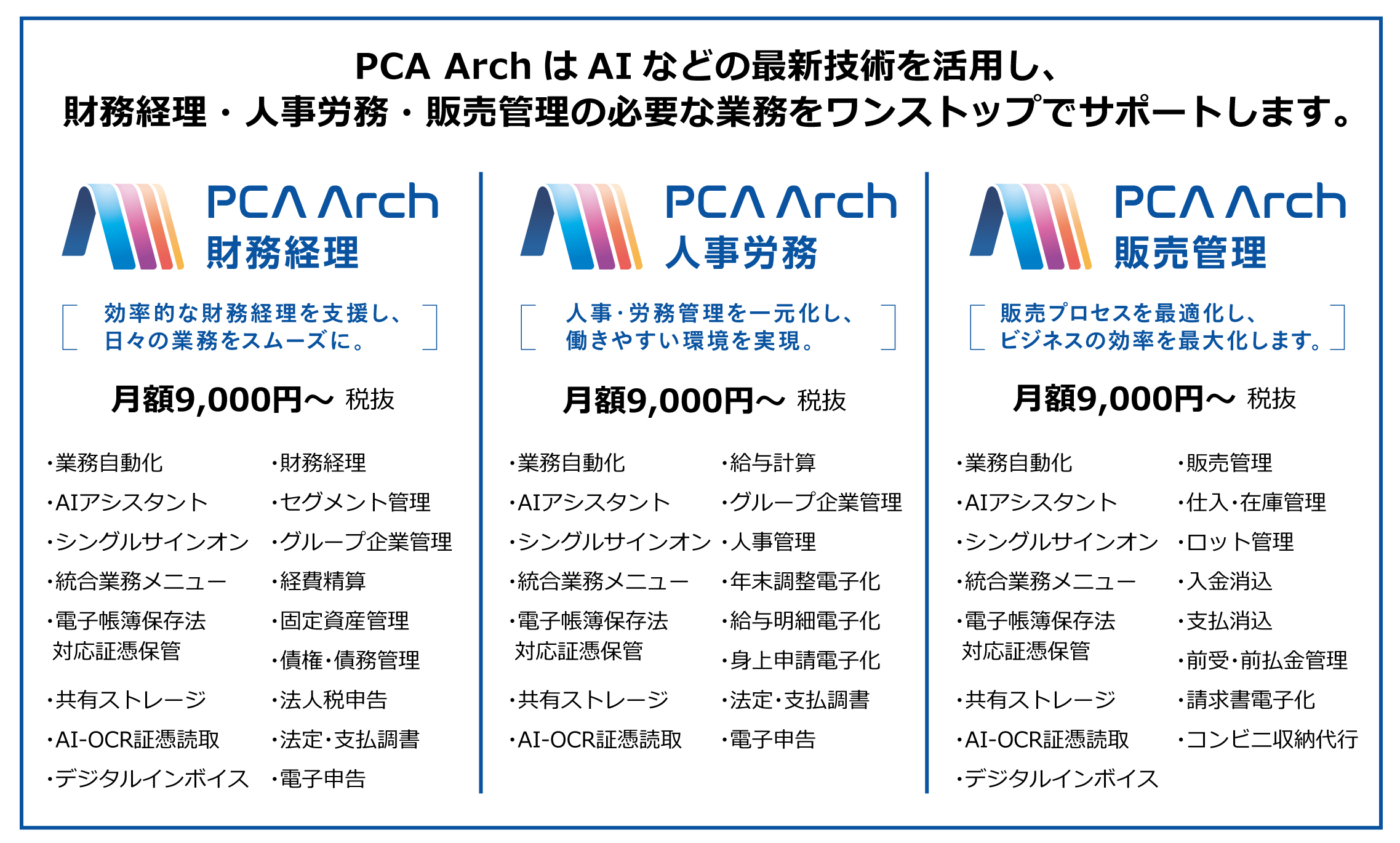 『PCA Arch』は、財務経理・人事労務・販売管理をワンストップでサポートする基幹業務クラウドサービスです。企業様が抱える「業務ノウハウの共有」「人的リソースの最適化」「業務のデジタル化」といった課題を解決できます。サービスは『PCA Arch 財務経理』『PCA Arch 人事労務』『PCA Arch 販売管理』の3つの業務サービスで構成されています。