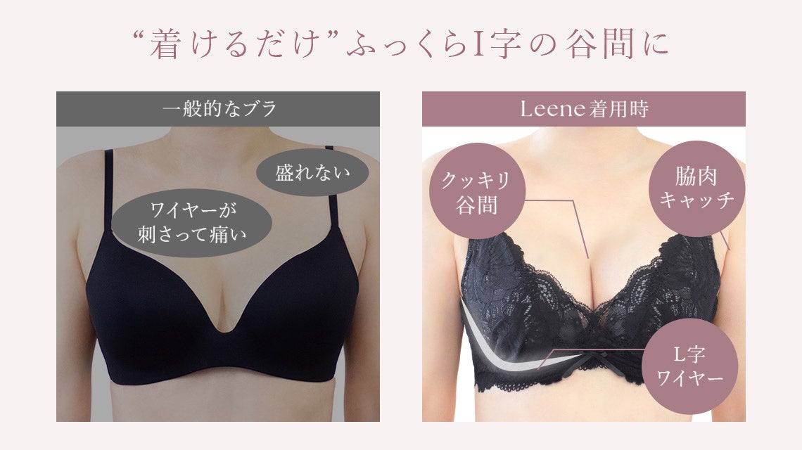 食い込みにくくストレスフリーな”L字ワイヤー”を使用することで、自胸を活かした自然なI字の谷間をメイクする「Leeneシリーズ」。