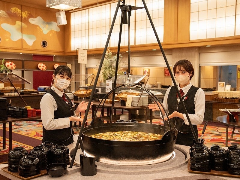 今回新たに、朝食ビュッフェ会場のメインシンボルとして直径80㎝の特大芋煮鍋を制作。山形の秋の風物詩として地元の人々に愛される「芋煮会」を365日体験できる。オープンキッチンでは、山形の味を知り尽くした料理人たちが地元素材を使用した料理のパフォーマンスを行う、30年以上守り続ける古窯秘伝のレシピで作る厚焼き玉子、古窯特製つや姫焼おにぎり、山形プリンシェフ考案の絶品フレンチトーストがリニューアルメニューとなる。特にフレンチトーストでは、トッピングとして県産の「滴り落ちる巣枠蜂蜜」を用意、その場で生蜂蜜を削ぎ取り召し上がれる疑似収穫体験が可能となっている。また、食空間の観点からも山形の夏祭り「山形花笠まつり」で使用される花笠を装飾するなど山形の豊かな農村文化をデザインして発信する。