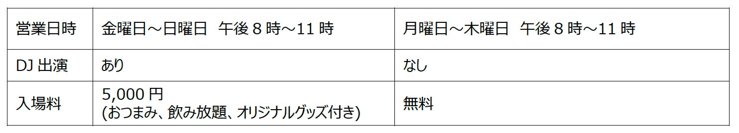 営業時間 :午後8時〜11時(ラストオーダー:フード 午後10時/ドリンク 午後10時30分)